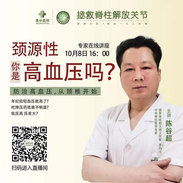石家莊直樂矯形中醫(yī)醫(yī)院醫(yī)院院長、中華脊柱醫(yī)學專家、平衡正脊健康法創(chuàng)立人、政府特殊貢獻津貼獲得者陳谷超先生,10月8日16:00通過網(wǎng)絡直播為大家?guī)韺I(yè)的頸源性高血壓防治科普知識,包括:什么是頸源性高血壓?青中年頸源性高血壓診斷方式方法、及頸源性高血壓科學防治等內(nèi)容