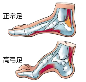 高弓足顧名思義指的是側面觀足弓高起,在行走或者負重過程中過程失去彈性,不能相對變平,從而不能完成正常站立和行走功能。由于足弓的改變而失去彈性,使得行走過程中足部受力部位位于前足足趾和后足足跟,部分畸形較重患者還合并足內翻導致足部受力位于足部外側緣。長時間的受力位置改變可引起胼胝形成,受力部位疼痛,同時由于改變了下肢的力學環境還可能使患者站立或者行走過程中感覺疲勞。嚴重的病例可以引起踝關節甚至膝關節的退變。